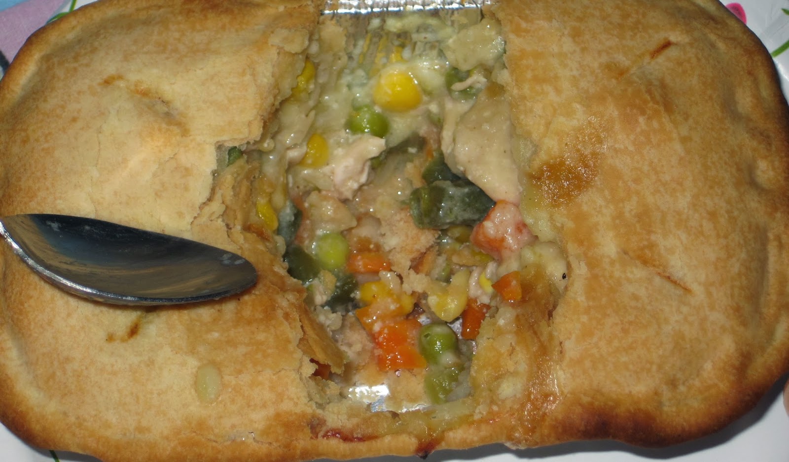 If you chose the bread loafs, it is pretty much the same. Unroll the 2 refrigerated pie crusts. Cut one of the round crusts in half and use a rolling pin to widen the narrowest part of each half, this is so the crust fits pretty nicely in the rectangular bread loaf pans. Get your loaf pans and place one of the halves in the bottom of each pan, stretching and shaping the dough to line the bottom and sides of the pan up to the lip. Put half of the chicken/vegging mixture into each loaf pan, then half of the onion gravy over each pie. Roll out the other pie crust and cut in in half. Lay each half over each of the pies and pinch the crust all around the edges until sealed. Take a steak knife and make a slit in about six or seven places scattered evenly over the pie crust top. Place the two loaves onto a baking sheet (in case of over spill) and bake for 35-40 minutes or until the crust is nicely browned. When it is finished, pull them out (leaving them on the cooking tray) and let them set up for about 10 minutes. It took another ten minutes after I cracked the crust for them to cool down enough for me to be able to eat them, so be careful - they are piping hot!